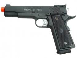Enterprise Arms pistol features a wide metal frame, a lightweight aluminum slide for improved efficiency, and adjustable hop-up.