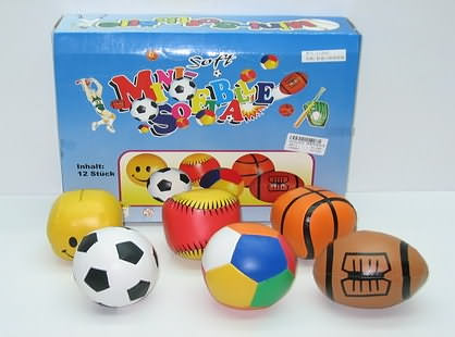 Sports Ball assorted soft balls One box contains a dozen balls Dimensions: 11 x 8.5 x 3 in Minimum order - 1 box