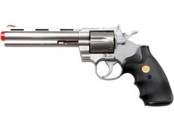 This Spring Revolver features a 6" barrel and six shot shell loading. It includes six single BB shells.