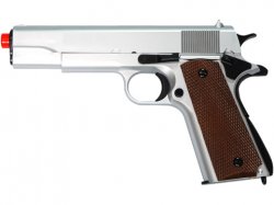 This Spring pistol features a 1911A1 design and is silver in color. FPS: 260 w/ 0.12g Action: Spring-action Hop-up: Fixed Other items needed: 0.12g BB, MUA961B - spare magazine Login for quantity discounts