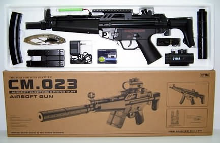 Silencer Rechargeable Ni-Cad battery & charger Safety eye goggle Red dot scope Clearing rod for jammed BBs High capacity magazine & standard magazine Sling Adjustable butt stock Speed BB loader Hop up system FPS: 240-280 All airsoft guns come with a blazing orange tip (not shown on picture) Double clips Price listed is for each gun
