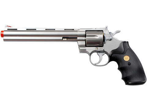 This Spring Revolver features a 8" barrel and six shot shell loading. It includes six single BB shells.