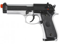 This Spring pistol features a M9 design and is a two-tone (silver/black) color. FPS: 260 w/ 0.12g Action: Spring-action Hop-up: Fixed Other items needed: 0.12g BB, MUA958 - spare magazine Login for quantity discounts