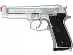 This Spring pistol features a M9 design and is silver in color. FPS: 260 w/ 0.12g Action: Spring-action Hop-up: Fixed Other items needed: 0.12g BB, MUA958 - spare magazine Login for quantity discounts