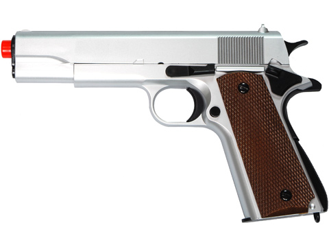 This Spring pistol features a 1911A1 design and is silver in color. FPS: 260 w/ 0.12g Action: Spring-action Hop-up: Fixed Other items needed: 0.12g BB, MUA961B - spare magazine Login for quantity discounts